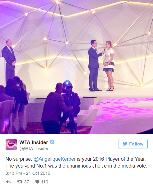 在周五晚的新加坡WTA年终总决赛(BNP Paribas WTA Finals Singapore presented by SC Global)晚宴上,科贝尔正式接受了颁奖。
