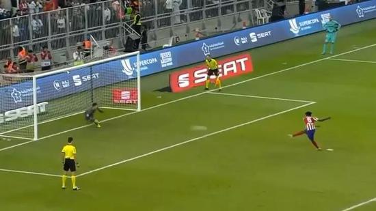 点球大战,身高1米99的库尔图瓦张开双臂,几乎覆盖了整个球门,也给了主罚球员强大压力,第一个登场的萨乌尔选择了刁钻的角度,虽然骗过库尔图瓦,却击中了门柱。