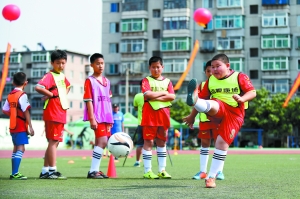 “动吧体育校园足球嘉年华”在辽宁省抚顺市第二十三中学拉开帷幕。在足球嘉年华上,孩子们参加丰富多彩的足球游戏,同时向专业的足球教练学习足球基本功。图为孩子们进行足球基本功训练。新华社记者 潘昱龙摄