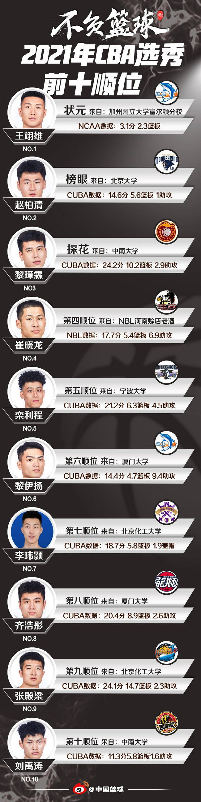 北京时间7月18日消息,2021年CBA选秀大会今天上午在青岛圆满落幕,旅美球员王翊雄成为新科状元,来自北京大学的赵柏清和来自中南大学的黎璋霖分别成为榜眼秀和探花秀。总计有30位球员在本次选秀大会上被CBA球队选中。