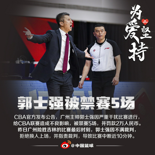北京时间11月1日,CBA联盟官方今天开出一则罚单,广州队主教练郭士强被禁赛五场,同时被处罚金两万元。