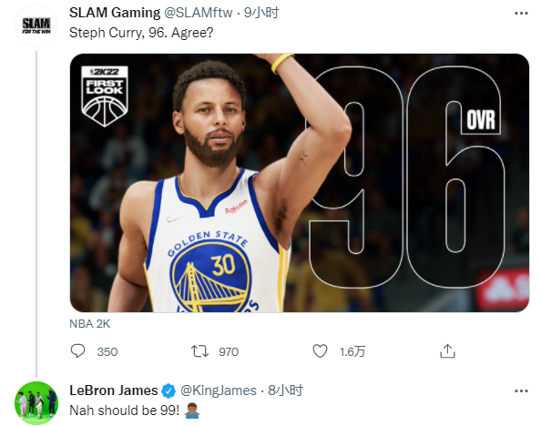 在另一条同样关于库里能力值的推特底下,詹姆斯同样评论道:“不!应该是99!”