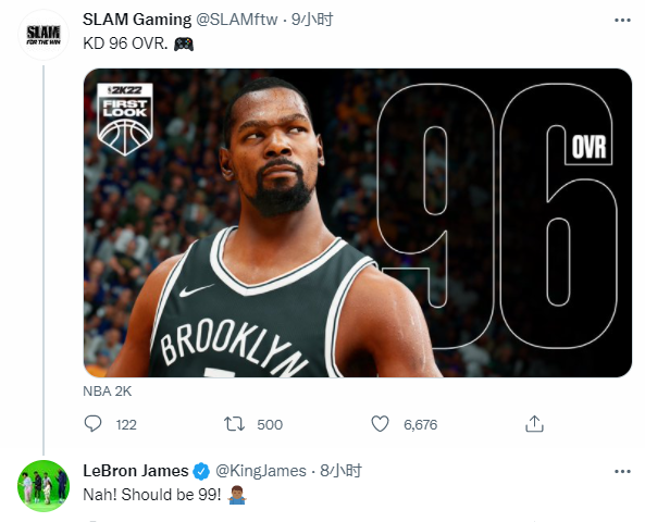 某推特账号发了一条杜兰特能力值96的内容,结果詹姆斯在底下评论道:“不!应该是99!”