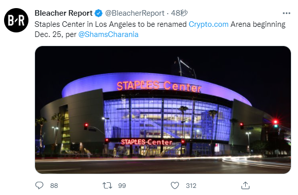 北京时间11月17日,洛杉矶湖人和快船的主场斯台普斯中心将于当地时间12月25日圣诞节后更名为Crypto.com球馆。