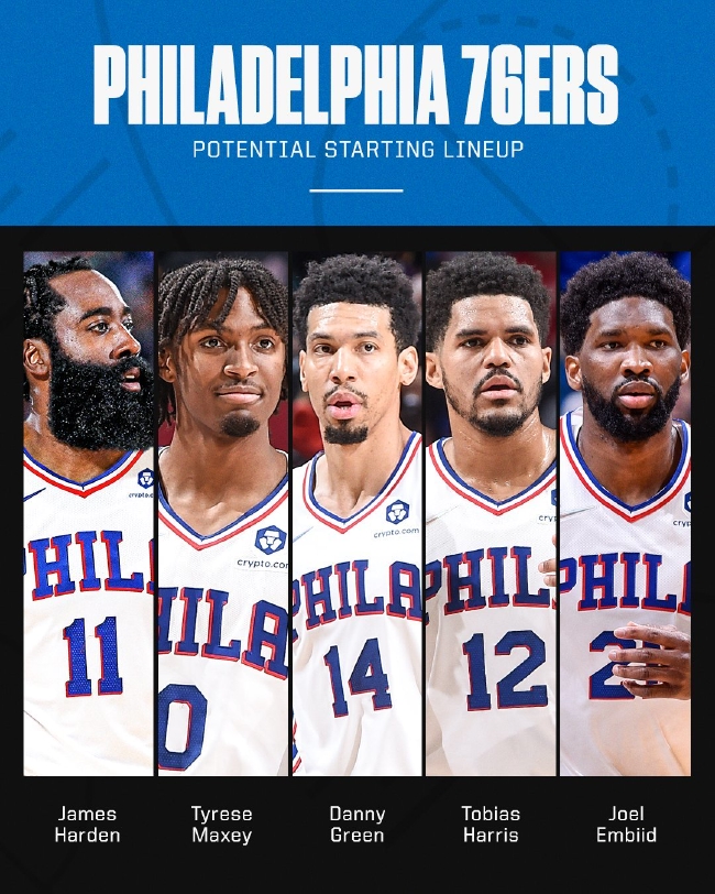 76人方面为:哈登、马克西、丹尼尔-格林、哈里斯和恩比德