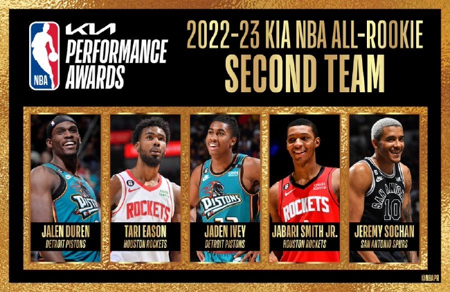 最佳新秀阵容二阵:杰伦-杜伦、塔里-伊森、杰登-艾维、小贾巴里-史密斯、杰里米-索汉。