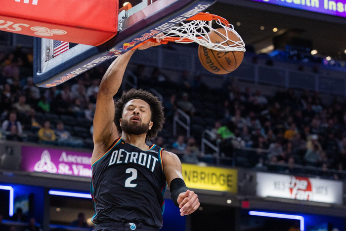本场比赛,活塞当家球星康宁汉姆防守端极具压迫性,效果极好;进攻端他冷血无情,最后时刻一记后仰中距离+顶着两人高难度拉杆锁定胜局!此役,康宁汉姆出战38分07秒,15中7,其中三分4中0,罚球4中4,得到18分8篮板8助攻5抢断3盖帽,正负值+6。