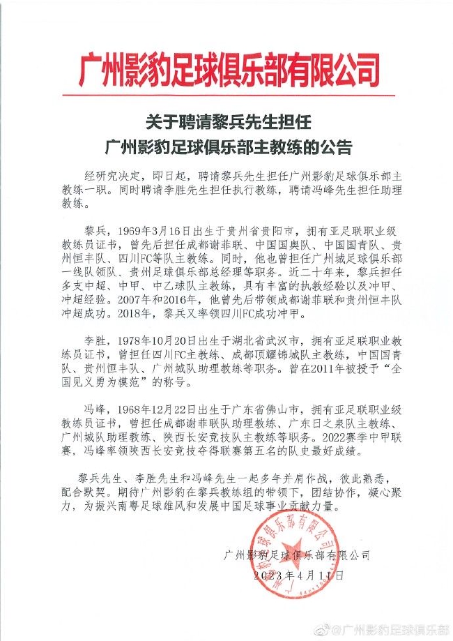 [公告]关于聘请黎兵先生担任广州影豹足球俱乐部主教练的公告