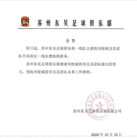 日前,中甲新军苏州东吴俱乐部发出官方公告,宣布俱乐部一线队主帅刘俊威下课。