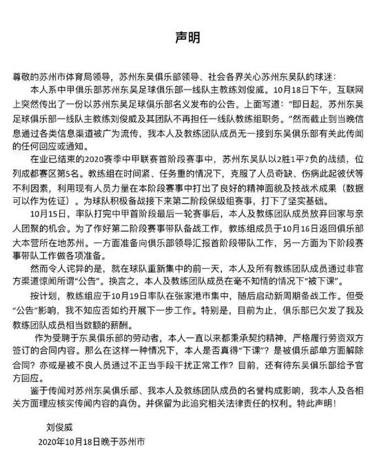 在得知下课消息后,刘导旋即在社交媒体上发布长文表达了疑惑,他说:“教练组成员于10月16日返回了球队大本营苏州,正为下阶段赛事带队做准备工作。但受到‘公告’影响,我不知应否如约开展下一步工作。”