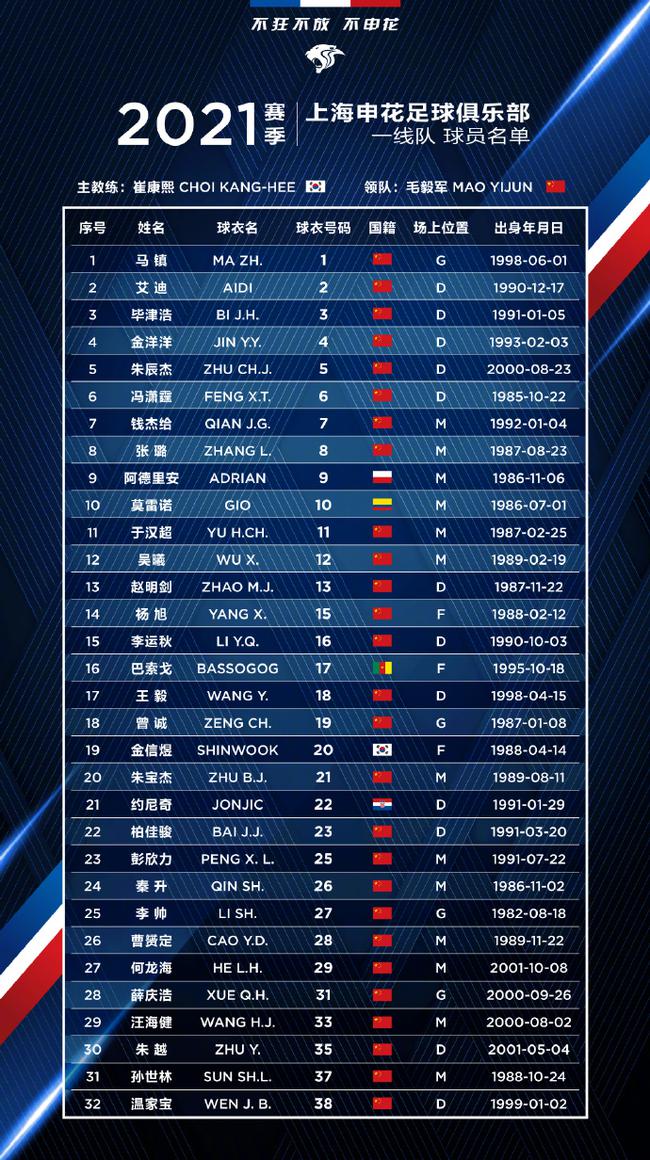 4月15日,上海申花官方发布了新赛季大名单。本赛季申花有吴曦、阿德里安等新鲜血液加盟,力求更好成绩。