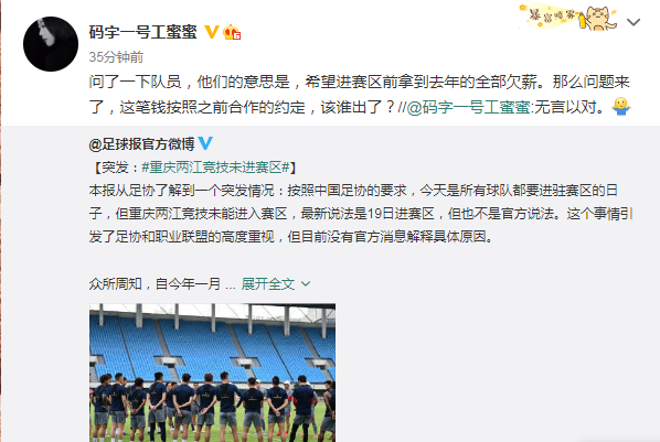 鲁蜜专访了《足球报》关于重庆队未进赛区的报道,并写道:问了一下队员,他们的意思是,希望进赛区前拿到去年的全部欠薪。那么问题来了,这笔钱按照之前合作的约定,该谁出了?