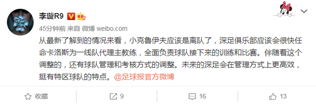李璇在个人微博上写道:从最新了解到的情况来看,小克鲁伊夫应该是离队了,深足俱乐部应该会很快任命卡洛斯为一线队代理主教练,全面负责球队接下来的训练和比赛。伴随着这个调整的,还有球队管理和考核方式的调整。未来的深足会在管理方式上更高效,挺有特区球队的特点。