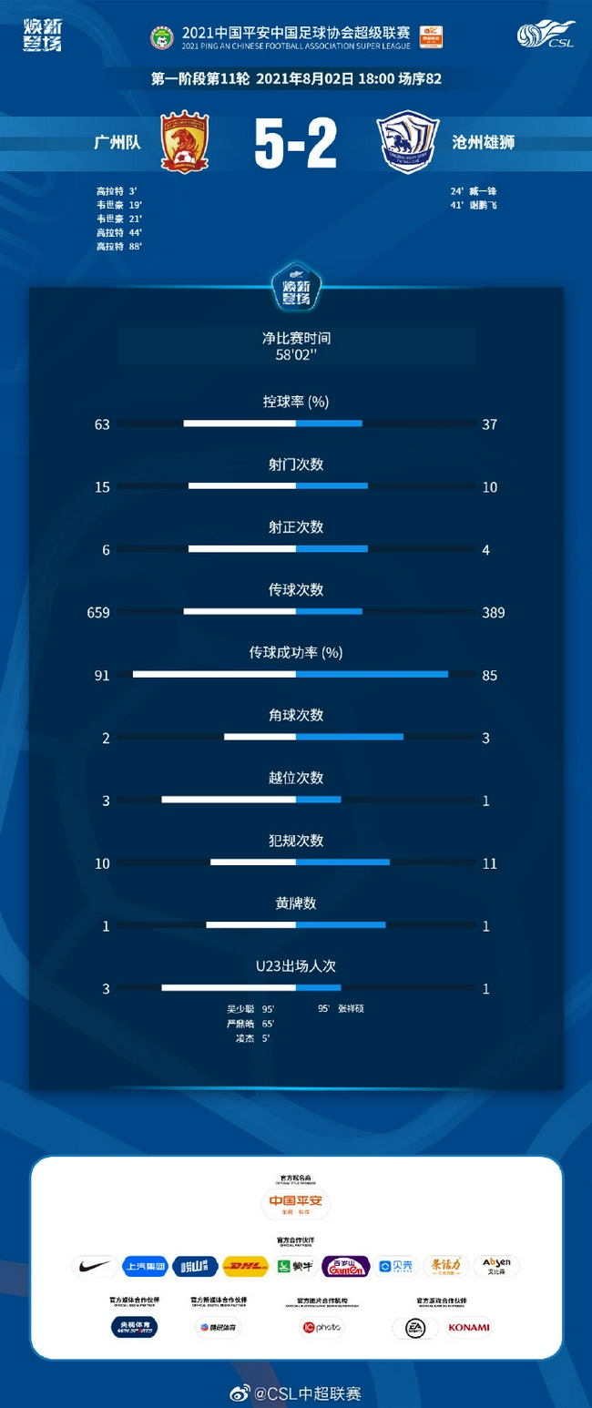 北京时间8月2日晚,中超第11轮赛事中广州队5-2战胜沧州雄狮。