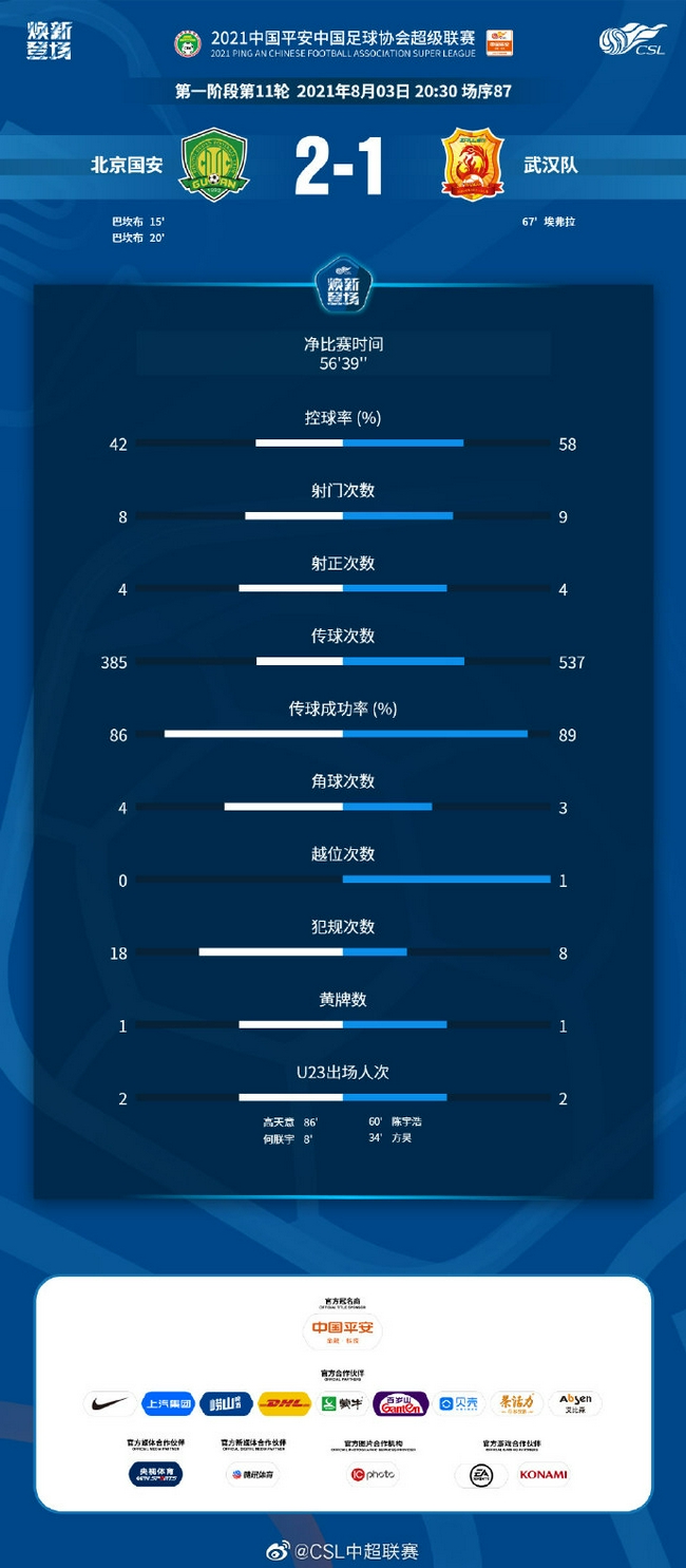 比赛后段双方持续在国安半场攻防对峙,武汉队未能继续追分。最终国安2-1胜出。