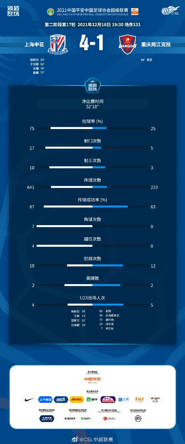 12月18日晚上,中超争冠组,申花对阵重庆队。最终申花4-1战胜重庆。