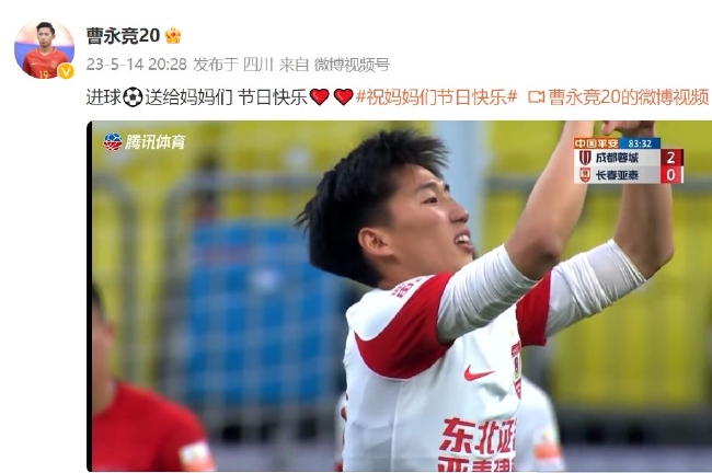 赛后,曹永竞也通过个人微博,将自己的进球送给妈妈们,祝愿她们节日快乐。曹永竞本赛季刚刚加盟长春亚泰,本场对阵成都蓉城的进球,是他为新东家打进的处子球。