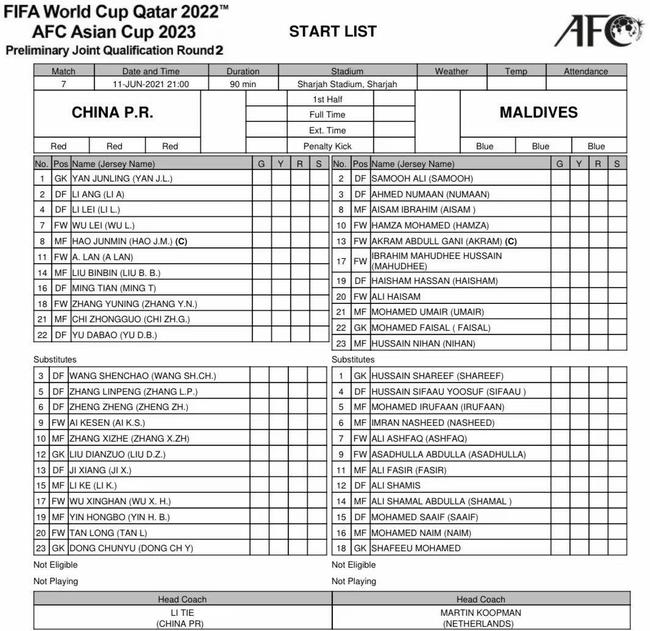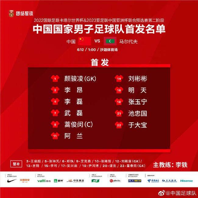 北京时间6月12日凌晨1点整,中国国家男足将在世预赛亚洲40强赛小组赛中对阵马尔代夫。赛前,国足公布了本场比赛的首发阵容及替补。