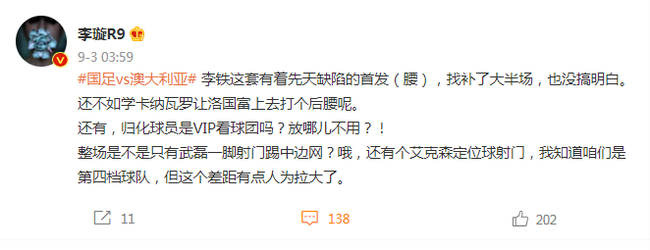 北京时间9月3日凌晨2点,世界杯亚洲区预选赛12强赛B组首轮,国足0-3不敌澳大利亚。赛后媒体人李璇在个人微博发文做出了点评。
