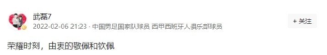 武磊写道:荣耀时刻,由衷的敬佩和钦佩!