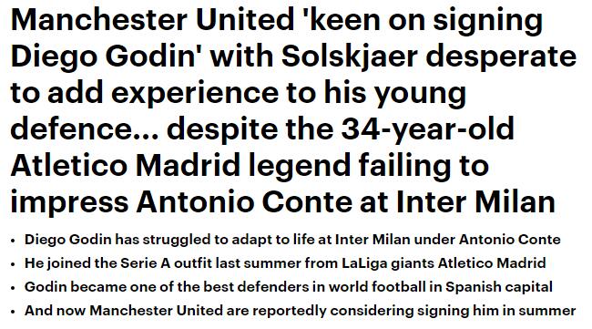《每日邮报》则称,曼联主帅索尔斯克亚希望引进一名有经验的后卫,34岁的戈丁是人选之一,而且乌拉圭人的价格预计不会太贵。除了曼联,对戈丁感兴趣的还有西甲的瓦伦西亚。