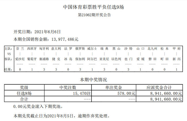 北京时间6月6日,足彩第21062期开奖结果揭晓。本期任九开出15470注,单注奖金578元。本期任九投注总额为13,977,486元.