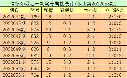 开奖回顾:第2022053期福彩3D奖号为764。奖号形态为组六,大小比为2:1,和值为17,奇偶比为1:2,012路比为1:2:0,跨度为3。