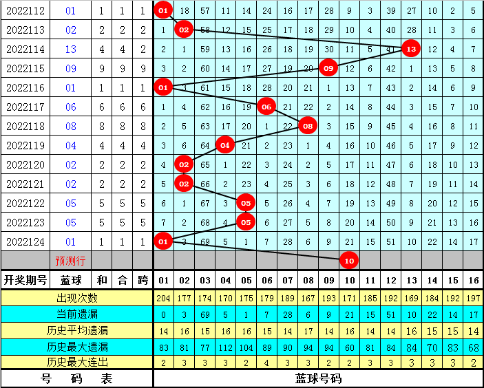蓝球5码参考:01 07 10 14 16