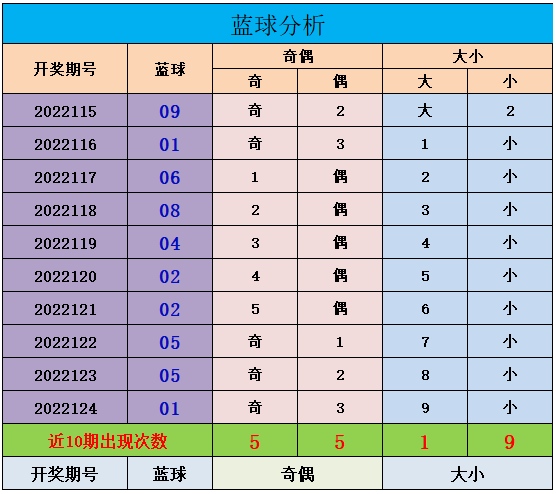蓝球分析:上期蓝球开出小奇数号码01,近10期奇偶比为5:5,奇数、偶数走势相同,本期蓝球关注偶数开出;最近10期蓝球大小比1:9,上期开出小号蓝球,本期关注大数开出,本期蓝球参考:10