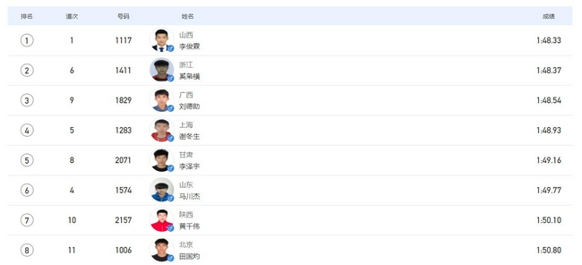 北京时间9月22日晚,在西安奥体中心进行的第十四届全运会田径比赛结束了男子800米决赛,山西队的李俊霖1分48秒33夺冠,浙江队的奚枭横1分48秒37获得亚军,室内800米全国纪录保持者、广西队的刘德助1分48秒54获得第三。