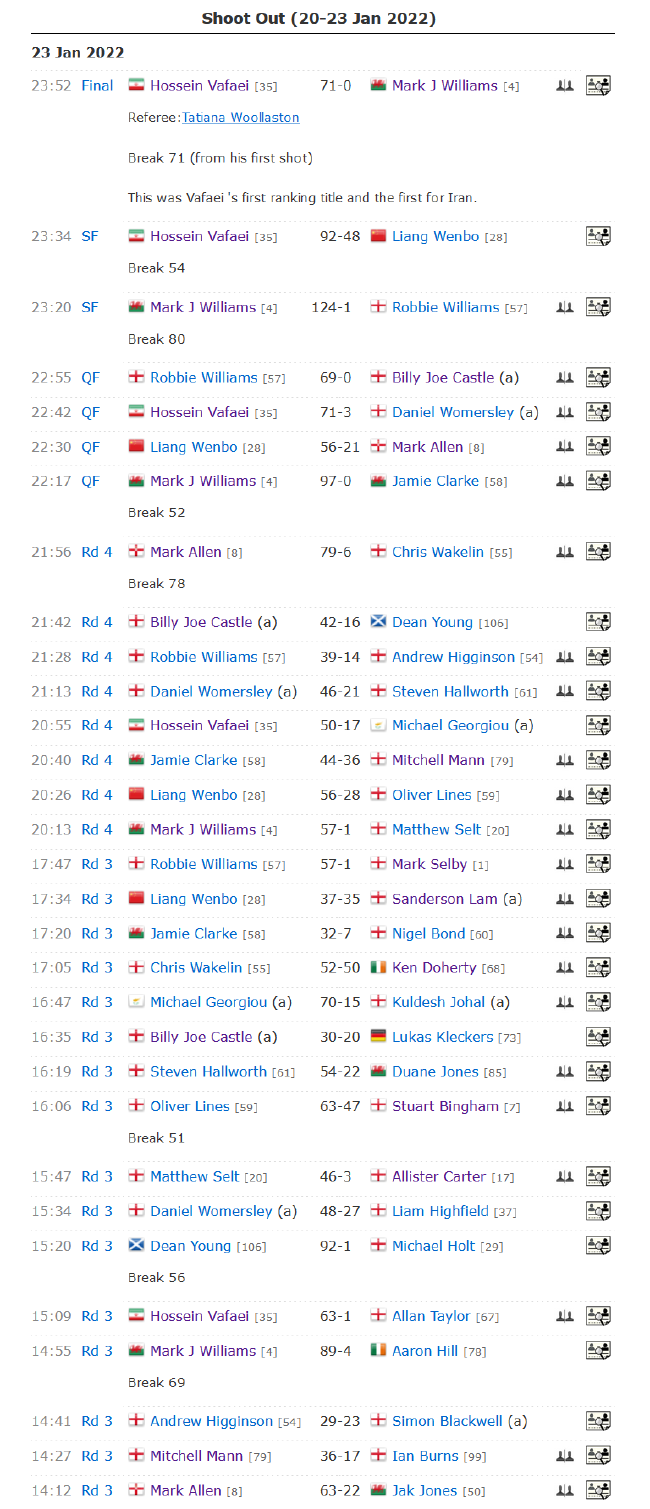 北京时间1月24日凌晨,2022斯诺克单局限时赛结束了最后一日的争夺。伊朗选手侯赛因-瓦菲在决赛中完全没给对手任何机会,他只用了一杆,就以71(71)-0击败了“金左手”马克-威廉姆斯,夺得了他个人职业生涯的首个排名赛冠军,也是伊朗的首个斯诺克排名赛冠军。瓦菲还在半决赛中凭借单杆54分,以92(54)-48击败了中国独苗梁文博。