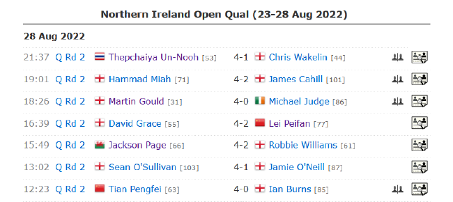 2022斯诺克北爱尔兰公开赛资格赛第6比赛日完全赛果: