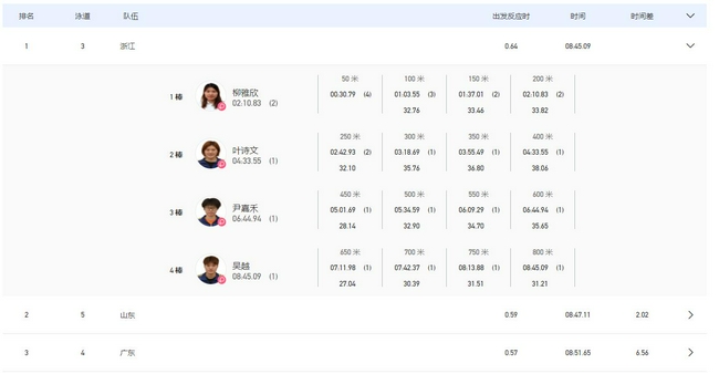 但问题是两人初始距离差得实在有些远,最后浙江队以8分45秒09夺冠。再次刷新全国纪录。山东队以8分47秒11获得亚军,广东队8分51秒65获得第三。