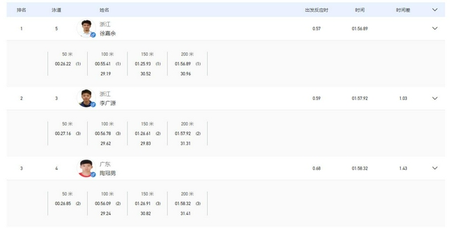 150米徐嘉余用时1分25秒93第一,陶冠男还是落后0.68秒第二,李广源第三。