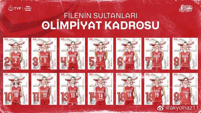 7月5日,土耳其女排公布14人名单,东京奥运会只能有12人参赛。