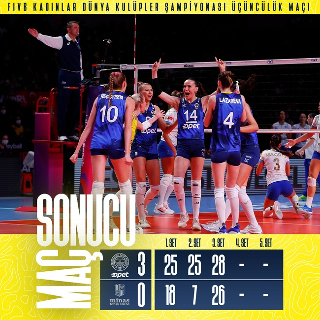 第三局20-22落后的费内巴切凭借费多罗夫采娃的后攻反击扳成22平。两队相持到26平后,M-波波维奇封死奥兹索伊的后攻、纳西门托扣球出界,费内巴切28-26险胜,3-0击败米纳斯。