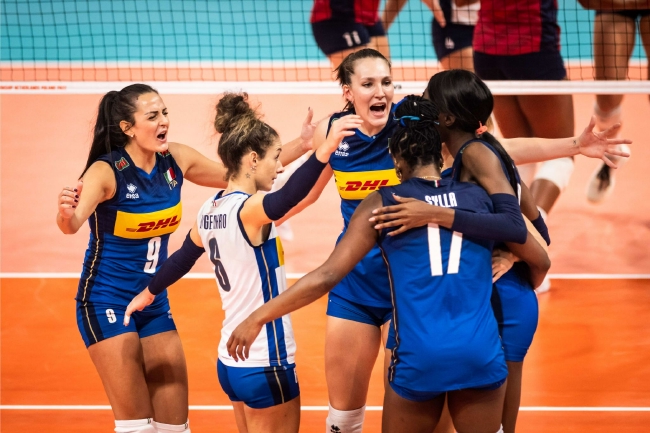 第三局埃格努和卢比安接连扣球失误,开局落后2分的美国扳成7平。埃格努自失增加、威尔海特攻拦强势,7-9落后的美国连夺4分11-9反超。中局意大利在华盛顿的发球轮卡轮14-17落后。埃格努强攻过轮后,意大利换上副攻齐里切拉。意大利追至20-21后连丢3分,美国24-20拿下局点。意大利在奥罗的发球轮4次挽救局点追成24平。25平后华盛顿快攻失手、达内西封死罗宾逊的扣球,意大利27-25险胜,3-0击败美国。