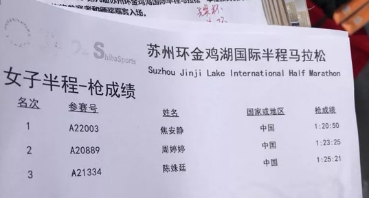 焦安静以1小时20分50秒的成绩获得2018苏州环金鸡湖国际半程马拉松比赛女子组冠军;周婷婷和陈姝廷分别以1小时23分25秒和1小时25分21秒夺得二三名。