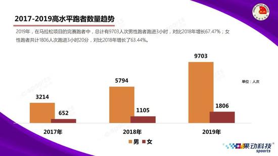 在高水平跑者的分布上,2019年,男性跑友共9703人次跑进3小时大关,女性跑友共有1806人次跑进3小时20分大关。