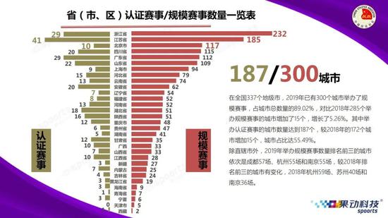 从赛事分布来看,2019浙江共举办了232场赛事,排名第一,江苏举办185场排名二,北京117场排名第三。