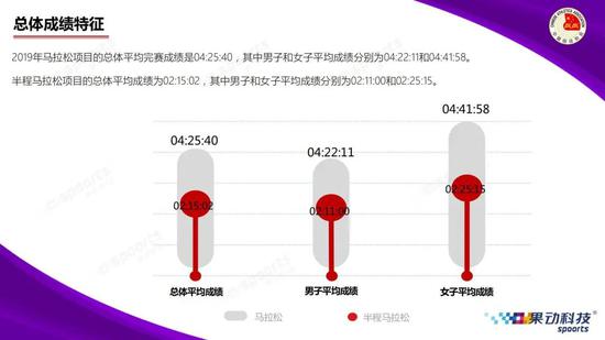 完赛成绩方面,2019年中国跑者的马拉松平均成绩为4小时25分40秒,其中男性跑者的平均成绩为4小时22分11秒,女性跑者平均4小时41分58秒。